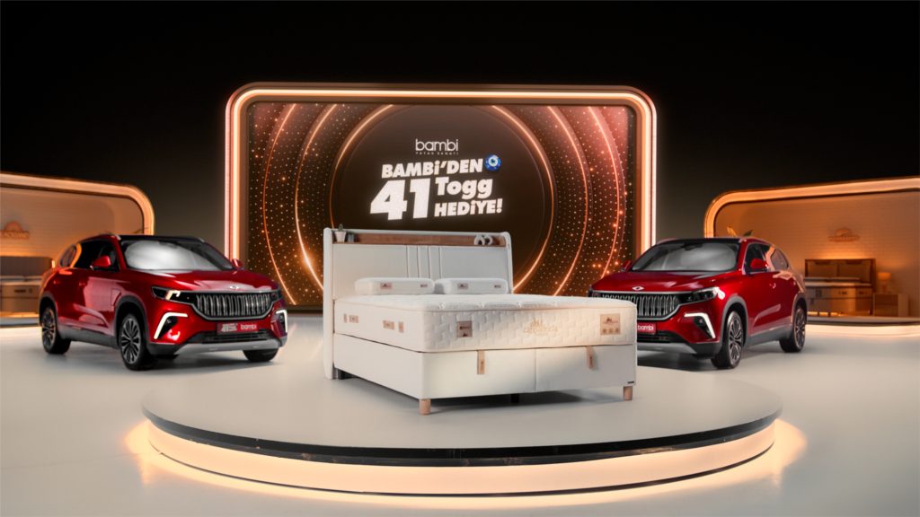 Türkiye yatak pazarına sunduğu ürünlerle uykuyu sanata dönüştüren Bambi Yatak, yeni reklam filmiyle Togg hediyeli kampanyasını başlattı. Markanın reklam yüzü Hülya Avşar’ın “Bambim Togg verir. Bir Togg yetmez bilir. İki Togg, üç Togg, dört Togg olsun. 4 de yetmez, 40 Togg olsun. Varsın olsun 41 kere. Nazarlar değmesin!” diye duyurduğu kampanya kapsamında 5 bin TL ve katlarında yapılan her alışveriş için bir çekiliş hakkı verilecek.